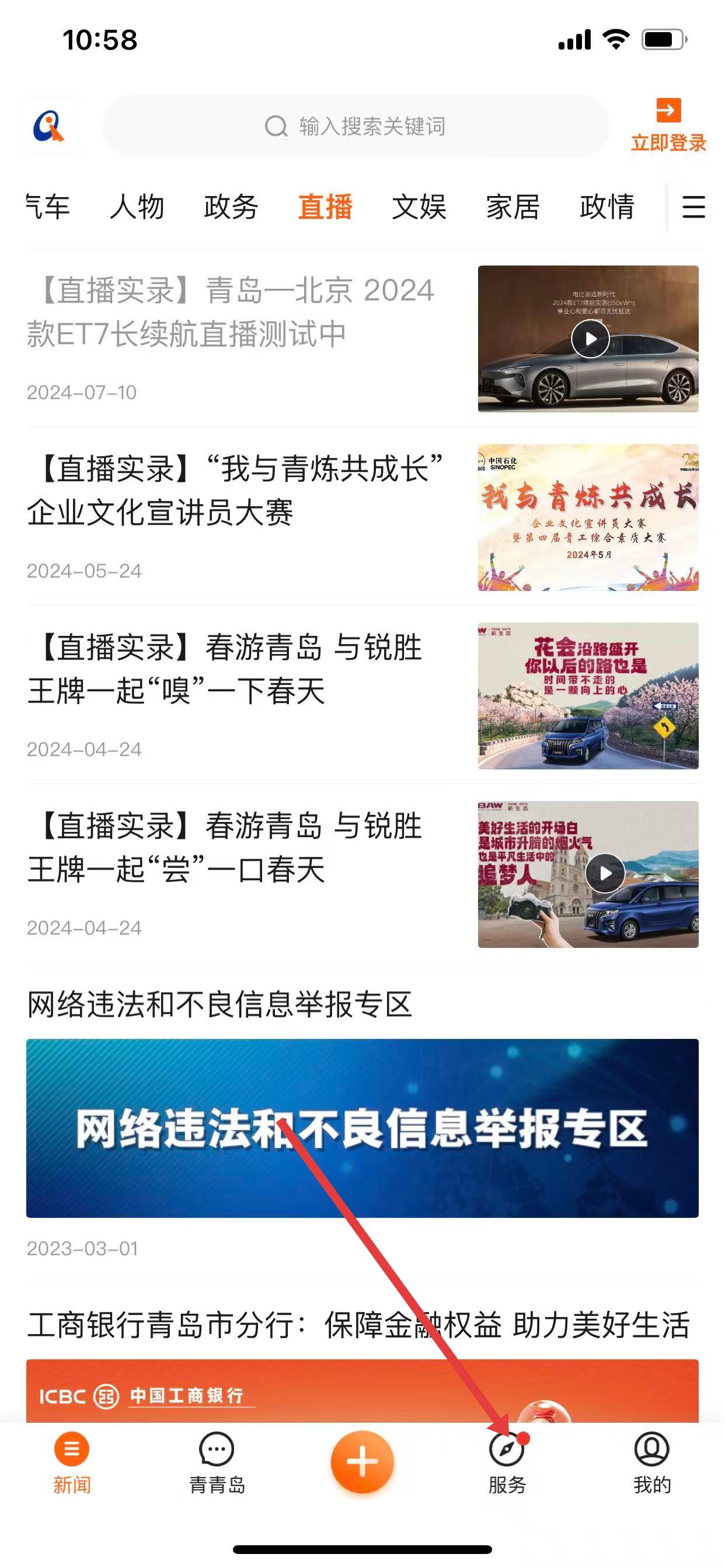 1、打開青島新聞App,點(diǎn)擊底部導(dǎo)航欄服務(wù)圖標(biāo)。