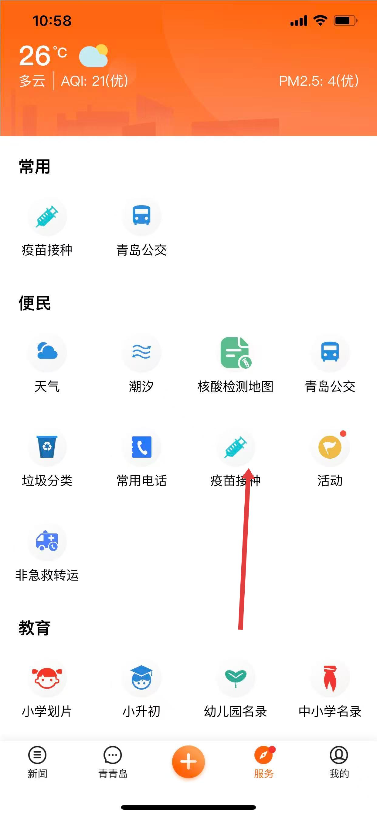 2、在服務(wù)頁(yè)面便民板塊,點(diǎn)擊疫苗接種選項(xiàng)。