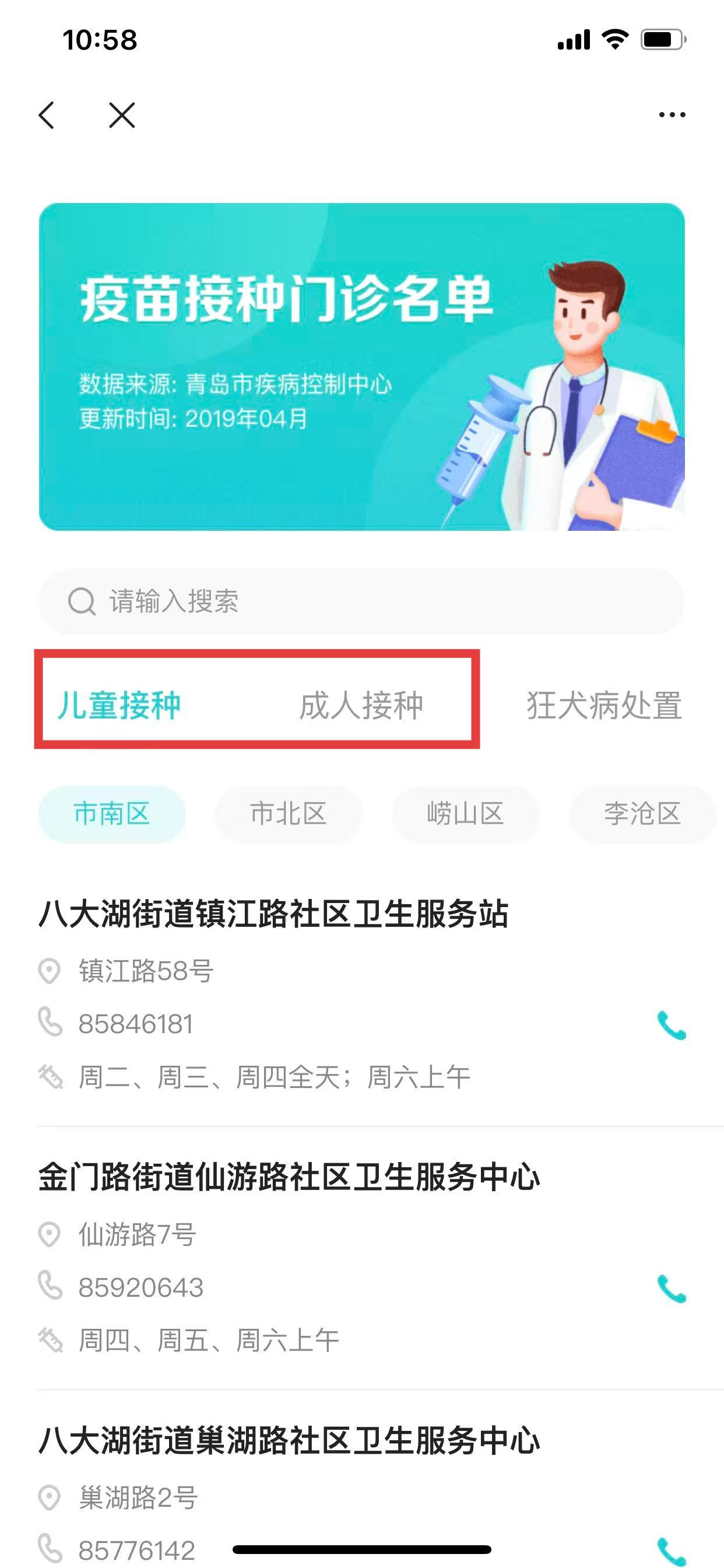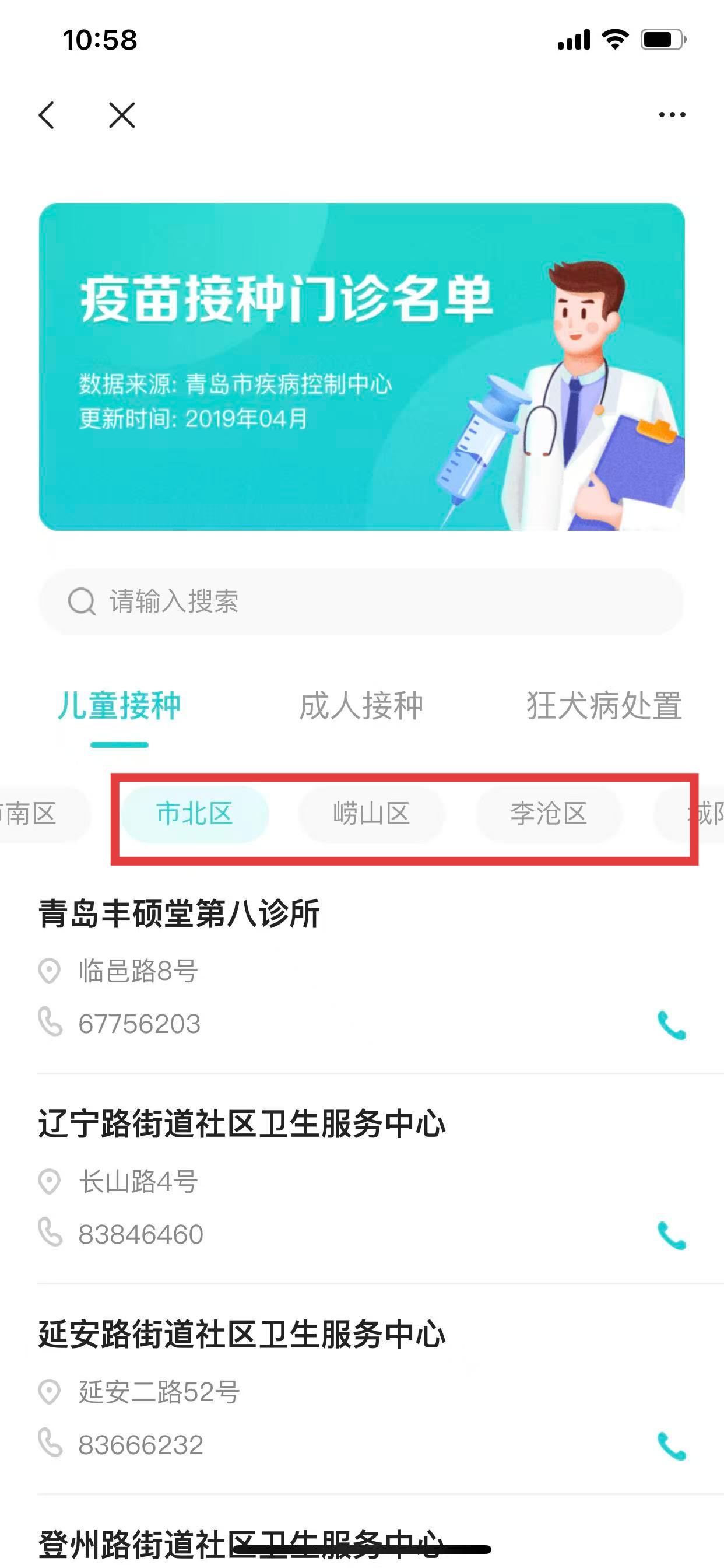 4、點(diǎn)擊所在區(qū)域,查看該區(qū)域內(nèi)疫苗接種門診的地址、聯(lián)系電話及接種時(shí)間,聯(lián)系門診或前往接種。
