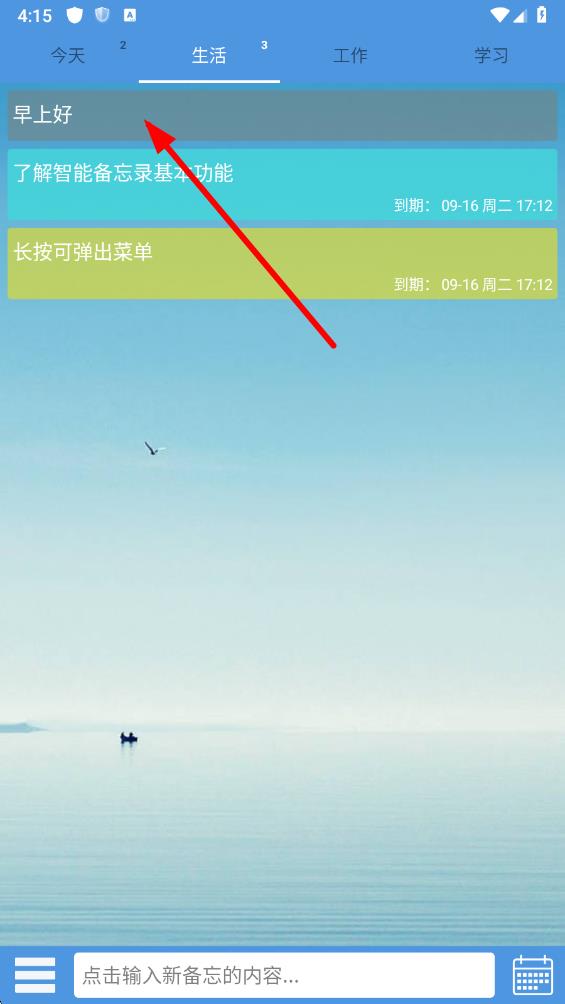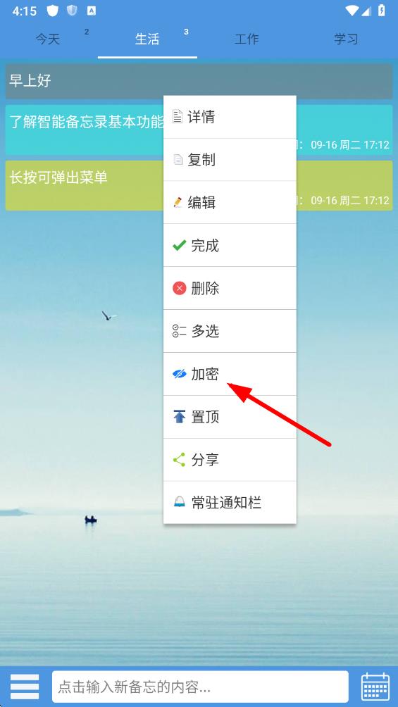 1、打開(kāi)高效備忘錄app,在主界面中,長(zhǎng)按想要加密的備忘錄內(nèi)容,調(diào)出操作菜單。
