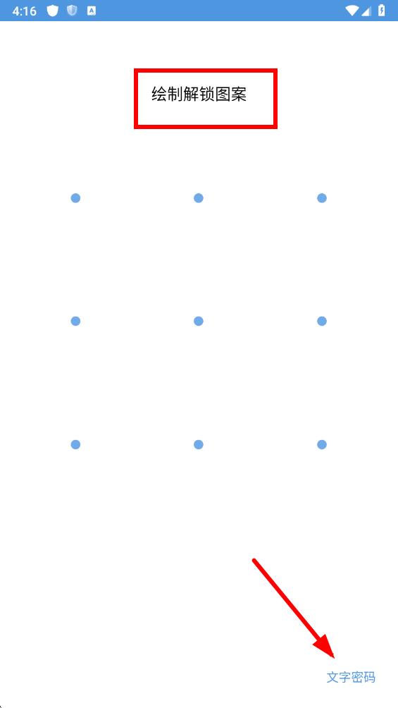 3、在密碼設(shè)置界面,可以設(shè)置圖案密碼,若不想設(shè)置圖案密碼,可點(diǎn)擊右下角的文字密碼。