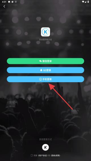 1、啟動(dòng)酷狗音樂App,在登錄選擇界面中,點(diǎn)擊手機(jī)登錄按鈕。