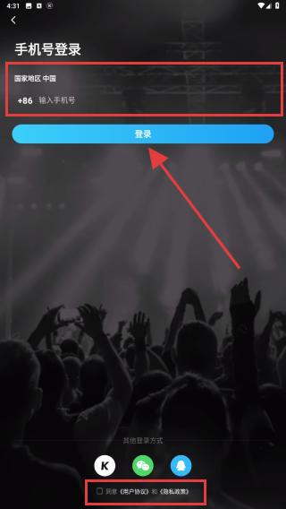 2、進(jìn)入手機(jī)登錄的頁面后,輸入需要登錄的手機(jī)號碼并勾選用戶協(xié)議與隱私政策,再點(diǎn)擊登錄。