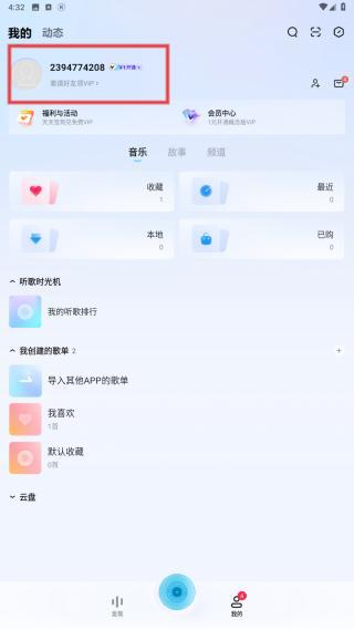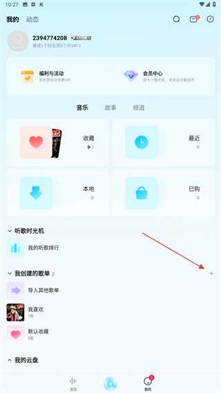2、進(jìn)入我的頁面內(nèi),在創(chuàng)建歌單右側(cè)點(diǎn)擊+的圖標(biāo)。
