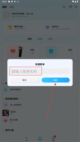3、在輸入框內(nèi)輸入歌單名稱后,再點(diǎn)擊確定即可。