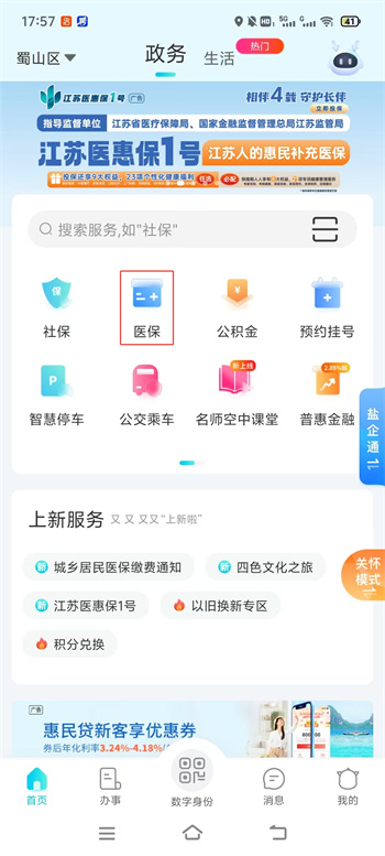 1、在來到軟件之后就會看到中間的功能欄一列有一個【醫(yī)保】,這里面掌管了你一切關(guān)于醫(yī)保各方面的內(nèi)容,點擊這個前往醫(yī)保繳費記錄查詢;