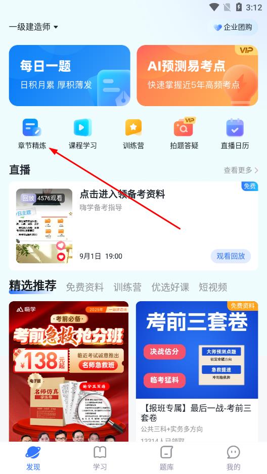 1、打開嗨學(xué)課堂App,在首頁點(diǎn)擊章節(jié)精煉選項(xiàng)。