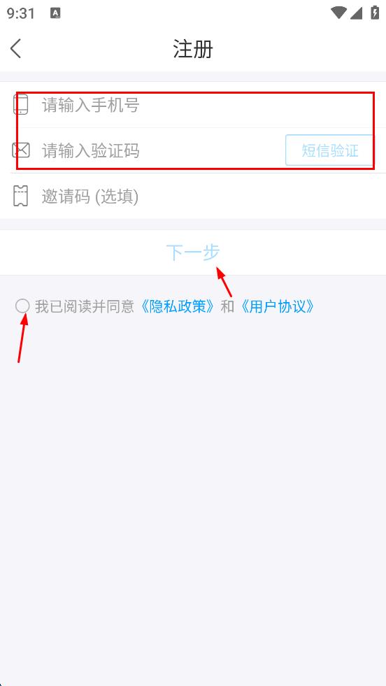 4、勾選同意隱私政策和用戶協議,然后請輸入手機,點擊“短信驗證”,輸入收到的驗證碼,最后點擊“下一步”,完成新用戶注冊流程。