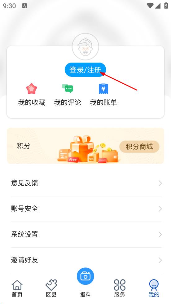 2、在個人中心頁面,找到“登錄/注冊”按鈕,點擊該按鈕,進入登錄注冊選擇頁面。