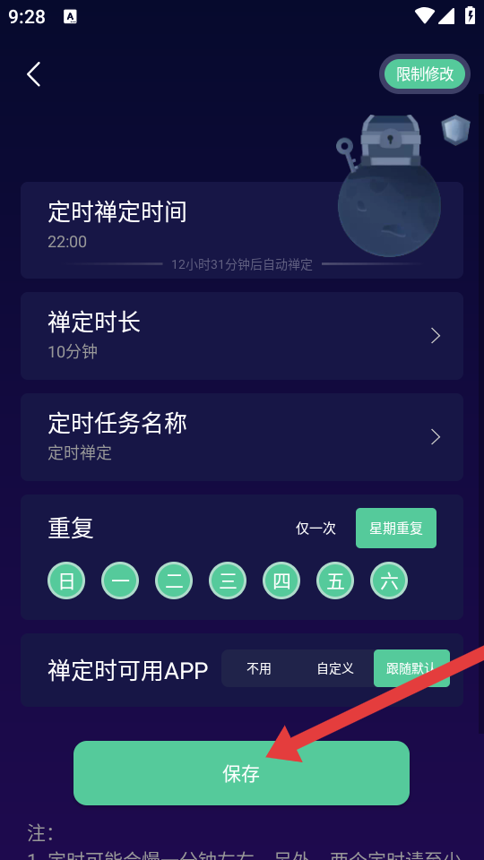3、設(shè)置好定時禪定時間等內(nèi)容后,點擊保存按鈕,確認(rèn)本次定時設(shè)置。