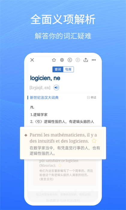 《新世紀(jì)法漢大詞典》是一部語(yǔ)言與百科相結(jié)合的綜合性大型法漢詞典,由法語(yǔ)界數(shù)十位專家學(xué)者擔(dān)綱,歷時(shí)十余載編纂而成,是法語(yǔ)學(xué)習(xí)者、研究者和翻譯工作者的理想工具書。融合《漢法大詞典》和《新世紀(jì)法漢大詞典》,外研社與海笛官方發(fā)布,法語(yǔ)學(xué)習(xí)者好幫手。具有便捷、穩(wěn)定的查詞功能,清晰發(fā)音,收藏/復(fù)習(xí)生詞等輔助學(xué)習(xí)功能。選擇正版應(yīng)用,學(xué)習(xí)更有保障!
