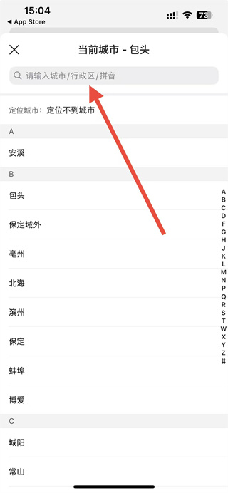 2、在城市選擇界面,點(diǎn)擊搜索框,輸入想要修改的城市名稱。