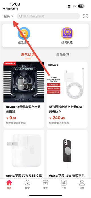1、在e城e家首頁,點(diǎn)擊左上角城市選擇區(qū)域,進(jìn)入城市選擇界面。