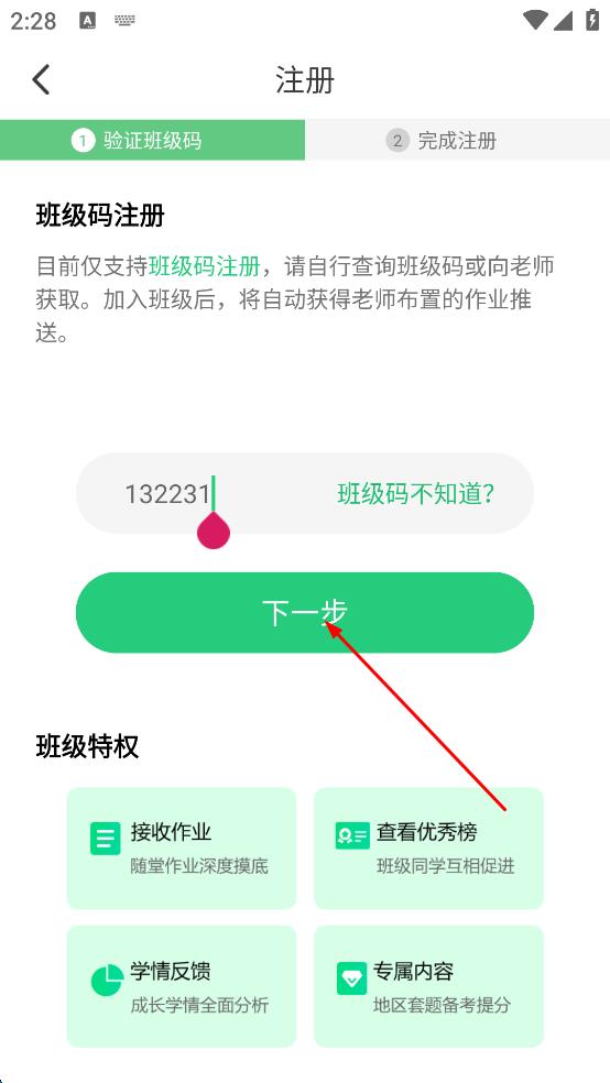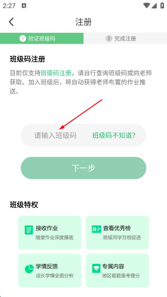 4、輸入班級(jí)碼后,點(diǎn)擊“下一步”按鈕,繼續(xù)完成注冊(cè)流程,后續(xù)可根據(jù)提示完善信息,完成注冊(cè),加入班級(jí)后能獲得作業(yè)推送等班級(jí)特權(quán)。