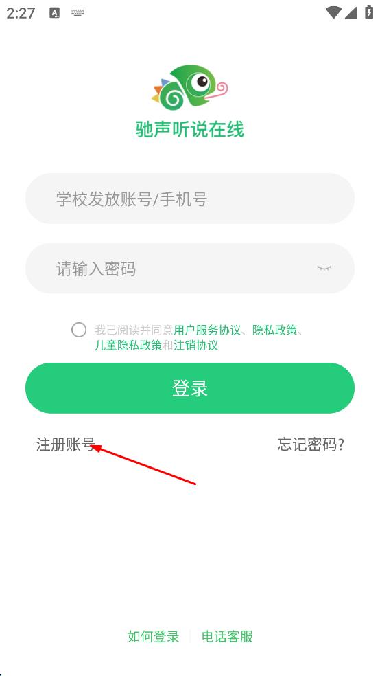 2、進(jìn)入馳聲聽(tīng)說(shuō)在線登錄界面,界面有賬號(hào)、密碼輸入框,還有“登錄”“注冊(cè)賬號(hào)”“忘記密碼?”等選項(xiàng),點(diǎn)擊“注冊(cè)賬號(hào)”選項(xiàng)。