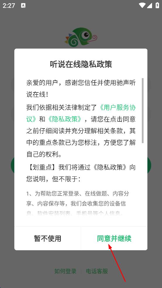 1、打開(kāi)馳聲聽(tīng)說(shuō)在線,進(jìn)入聽(tīng)說(shuō)在線隱私政策界面,界面說(shuō)明依據(jù)法律制定了用戶服務(wù)協(xié)議和隱私政策,重點(diǎn)條款已標(biāo)注,點(diǎn)擊“同意并繼續(xù)”按鈕。