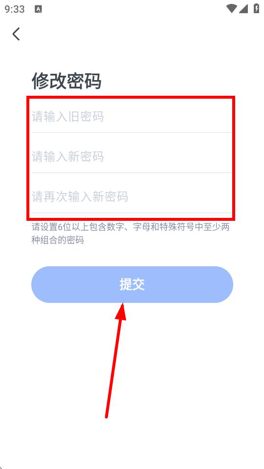 4、在修改密碼頁面,依次輸入舊密碼、新密碼、再次輸入新密碼,點(diǎn)擊提交,即可完成密碼修改。