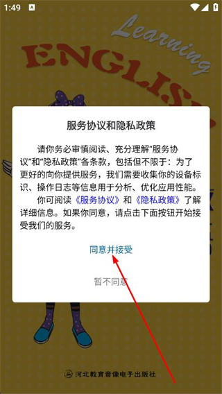1、打開冀教學英語,在彈出的窗口中,點擊同意并接受。