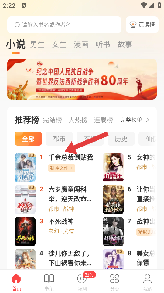 1、打開連尚讀書APP,需要在首頁推薦榜選擇自己要聽的小說。