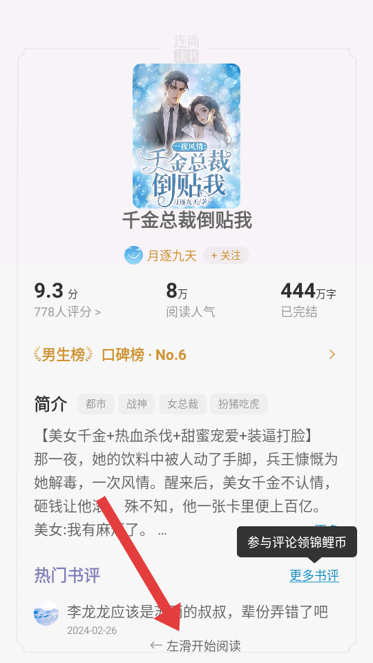 2、進(jìn)入小說的詳情頁,需要左滑開始閱讀,進(jìn)入閱讀的界面。