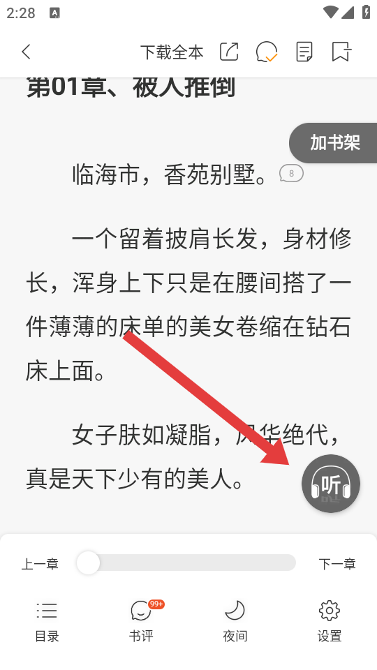3、在閱讀界面先點擊屏幕調(diào)出菜單,再點擊聽字圖標(biāo),進(jìn)入聽書界面。