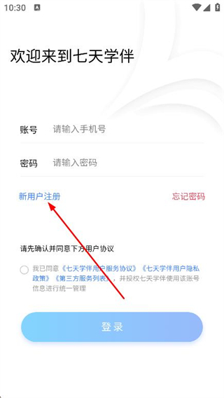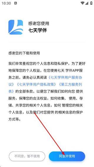 1、打開七天學(xué)伴,在彈出的頁面中點擊同意并使用。