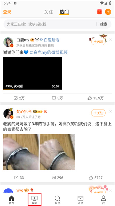 1、進(jìn)入到微博的主界面之中后,用戶需要點(diǎn)擊屏幕下方的視頻按鈕來進(jìn)行視頻的查看;