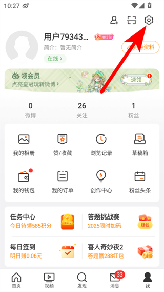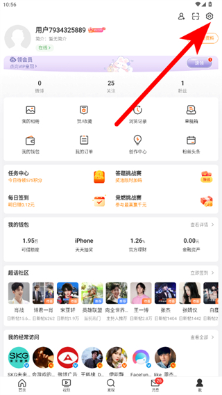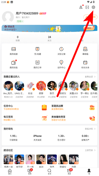 2、在個人頁面右上角,點(diǎn)擊設(shè)置圖標(biāo),進(jìn)入設(shè)置界面。