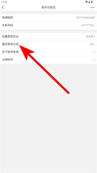 4、在賬號與安全頁面點(diǎn)擊最近登錄記錄,即可查看微博的最近登錄記錄。