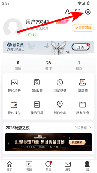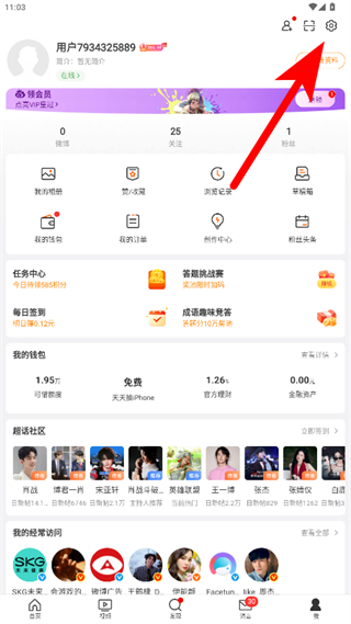 2.在個人主頁界面,點(diǎn)擊右上角的設(shè)置圖標(biāo)。