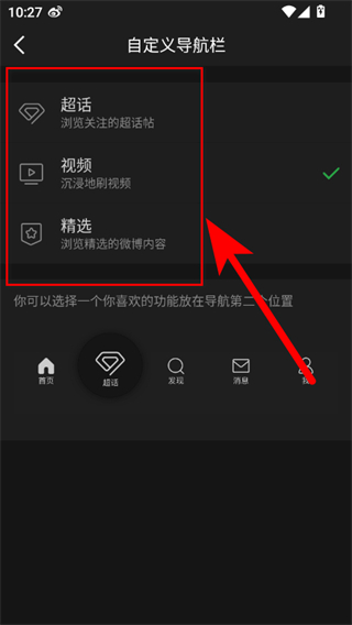 4、在自定義導(dǎo)航欄頁面選擇喜歡的功能如超話、精選等,即可完成微博自定義導(dǎo)航欄內(nèi)容的修改。