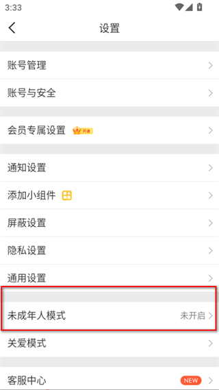 3、在設(shè)置界面中,點(diǎn)擊未成年人模式選項,進(jìn)入未成年人模式頁面。