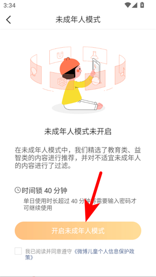 4、在未成年人模式頁面,點(diǎn)擊開啟未成年人模式按鈕,按照提示完成青少年模式的開啟操作。