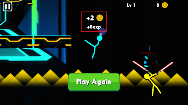 游戲中有很多不同的模式,生存模式下你需要消滅不斷出現(xiàn)的怪物;一人模式你會和電腦1V1進(jìn)行對決;雙人模式你可以和你的小伙伴實(shí)時對戰(zhàn),看誰的技術(shù)更勝一籌。經(jīng)典的火柴人外型,不一樣的激烈戰(zhàn)斗。