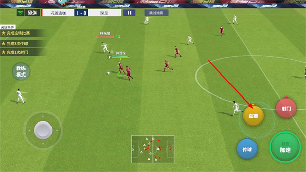 2、當球員處于合適位置時,點擊直塞或傳球,與隊友配合,創(chuàng)造射門機會。