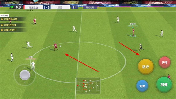 1、在比賽中操控球員帶球推進,通過左側(cè)虛擬搖桿調(diào)整方向,尋找進攻機會。