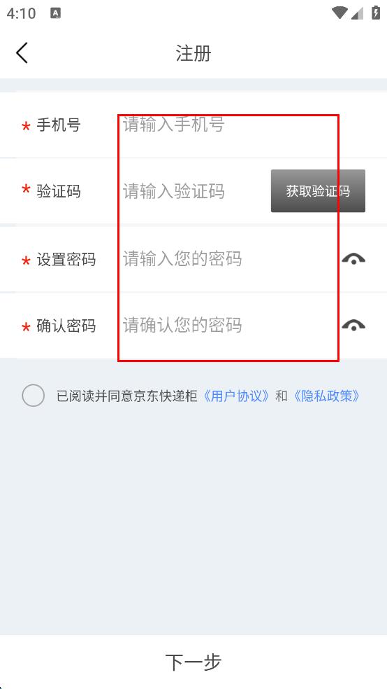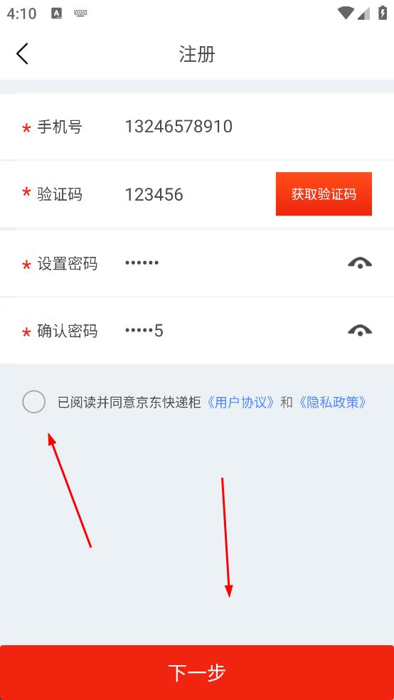 4、確認(rèn)手機(jī)號(hào)、驗(yàn)證碼、密碼輸入無(wú)誤,且勾選已閱讀并同意京東快遞柜用戶協(xié)議和隱私政策后,點(diǎn)擊下一步按鈕,繼續(xù)后續(xù)注冊(cè)流程。