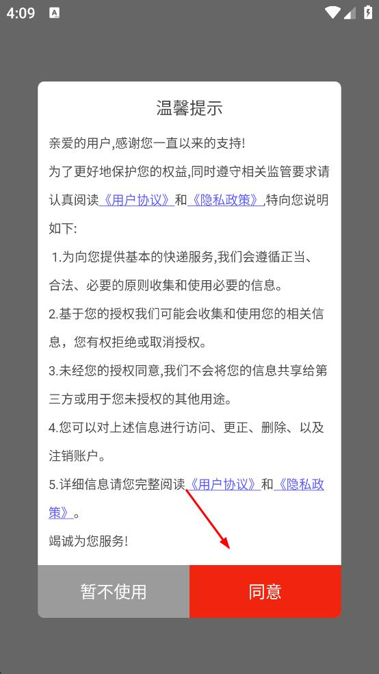 1、打開京東快遞APP,會(huì)彈出溫馨提示頁(yè)面,仔細(xì)閱讀相關(guān)內(nèi)容后,點(diǎn)擊同意按鈕,進(jìn)入到登錄頁(yè)面。