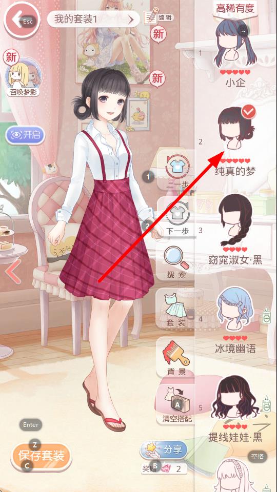 2、在自由換裝界面,右側(cè)有各類服飾分類欄,滑動(dòng)找到想更換的套裝部件,點(diǎn)擊對(duì)應(yīng)部件像選擇純真的夢發(fā)型進(jìn)行更換,逐步搭配出目標(biāo)套裝樣式。