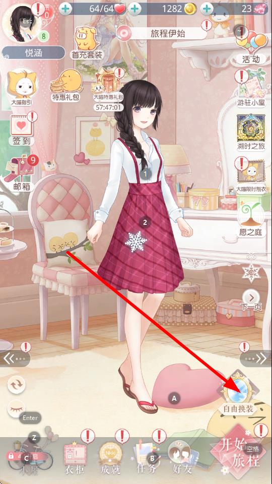 1、打開奇跡暖暖游戲,在主界面點(diǎn)擊右下角自由換裝按鈕,進(jìn)入換裝操作頁面,這是開啟套裝換裝的關(guān)鍵入口。