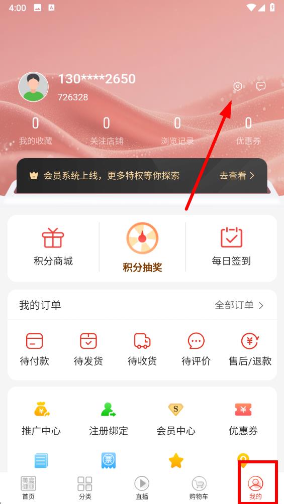 1、打開(kāi)美宸健業(yè)app點(diǎn)擊底部導(dǎo)航欄中我的選項(xiàng)進(jìn)入個(gè)人頁(yè)面,在頁(yè)面右上角找到并點(diǎn)擊設(shè)置圖標(biāo)。