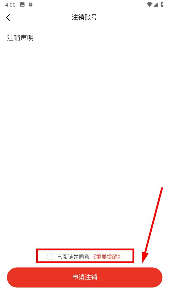 3、進(jìn)入注銷(xiāo)賬號(hào)頁(yè)面后,確認(rèn)無(wú)誤后勾選已閱讀并同意,最后點(diǎn)擊申請(qǐng)注銷(xiāo)按鈕完成賬號(hào)注銷(xiāo)流程。