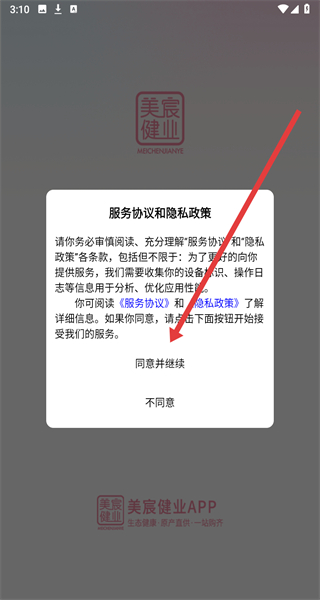 1、點(diǎn)擊“服務(wù)協(xié)議和隱私政策”彈窗的“同意并繼續(xù)”,進(jìn)入美宸健業(yè)APP首頁(yè)。
