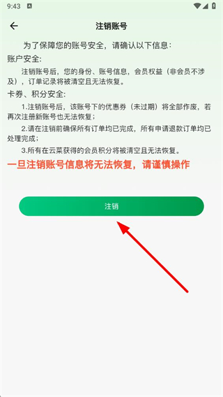 5、在注銷賬號確認(rèn)頁面,仔細(xì)閱讀相關(guān)提示信息后,點擊注銷按鈕,完成賬號注銷。