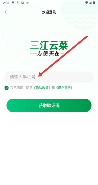 1、打開三江云菜APP,同意隱私政策協(xié)議后進(jìn)入主界面。
