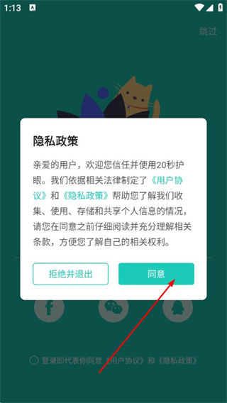 1、打開20秒護眼APP,在隱私政策提示框中點擊同意。