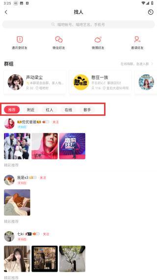3、在招人的頁面下方,可以通過不同的方式去添加好友,也可搜索唱吧號、昵稱等。