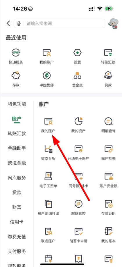1、打開郵政儲蓄銀行手機app,在首頁找到搜索欄下方的我的賬戶選項并點擊。