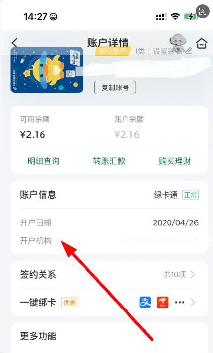 3、進入賬戶詳情頁面,在開戶機構(gòu)一欄中,即可查看該銀行卡對應的開戶行支行名稱。