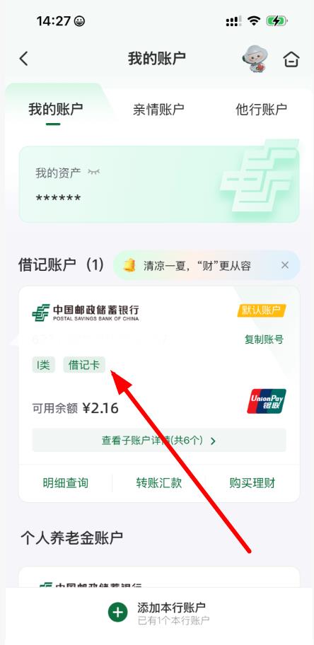 2、進入我的賬戶頁面后,在借記賬戶列表中,點擊要查詢開戶行的銀行卡卡號。